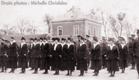 This is a painting by Michelle Christides of Oleda Christides, nee Joure, in front of Caserne Damremont, General Pershing's HQ for 2,000,000 American men of the First Army. It was from here that about thirty of the 223 SC women who served in France, connected the front lines to the general command. WWI was the first war in history for which technology allowed this to happen.