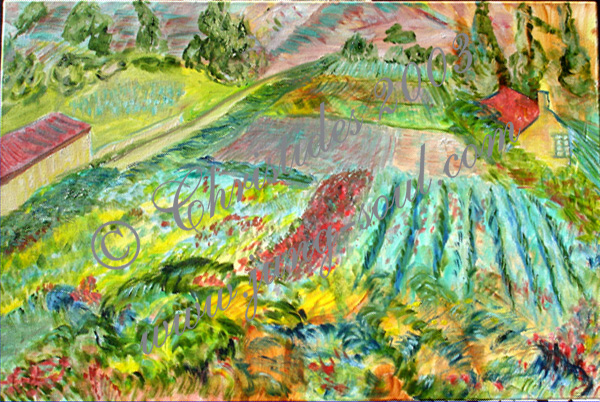 This painting is dedicated to Sallie Kate Park. While driving through NE France in June, 1996, we came upon an immense rolling field of poppies with a church touching the horizon from a hilltop.