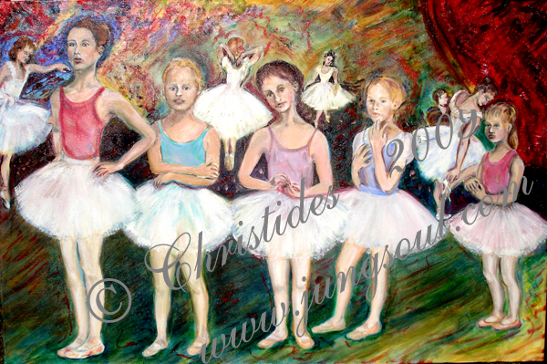 Waiting to Go On -- Inspired by Rob Mattson's photograph of tryouts for "The Nutcracker" student ballet production by the Sarasota Dance Theatre, September 16, 2008, in Sarasota Herald Tribune. 24" X 36" or 60 X 90 cms.