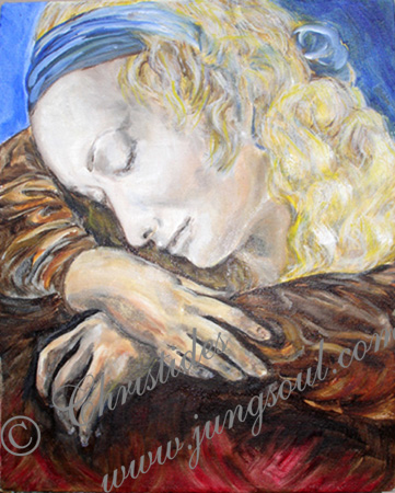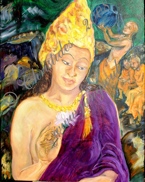 Padmapani, Bearer of the Lotus -- 28 X 36 " or 70 X 90 cms. Inspired by the photograph by Benoy K. Behl in the January 2008 National Geographic "Faces of the Divine" by Tom O'Neill of the painting in the temple caves at Ajanta, Central India, hand-cut caves painted by Buddhist monks in the 5th Century.