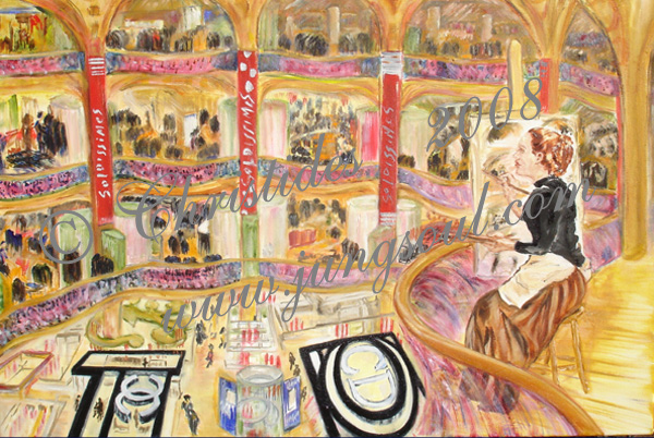 The Artist of the Galeries Lafayette -- Inspired by Eric Sander's photograph of an American artist, dressed in 19th-century fashion painting in the Louvre, accompanying a Smithsonian October 2002 article by Joseph A. Harris, "Master Class" on this public tradition since the royal palace became a museum after the French Revolution. I combined this photo with another of the 19th-century department store in Paris, decked out in 21st-Century branding and consumerist shiney plastic and glass, with the "I--O" of computer symbology, by Bob and Darlene Johnson in their article in February 2008 Style, "Beyond the Lights." 24" X 36" or 60 X 90 cms.