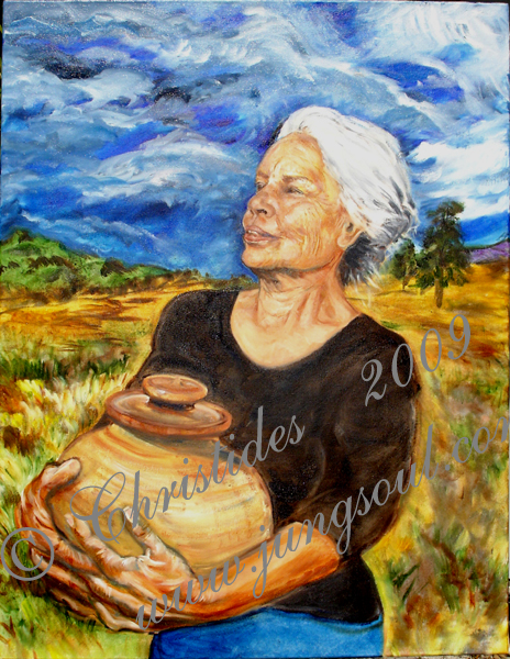 Homeland Security -- inspired by the photo of Rina Swentzell, PhD by Brown Cannon III in "All the Things I've Seen," an article in the Parks issue on "Stewards of Sacred Land," National Park Foundation magazine number 3. 28" X 36" or 70 X 90 cms.