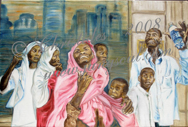 Immigration Issues -- Inspired by Christopher Calais' photograph of a Somali Bantu family's "Coming to America," an article by Gregory Jaynes in January 2004 Smithsonian. 24" X 36" or 60 X 90 cms.